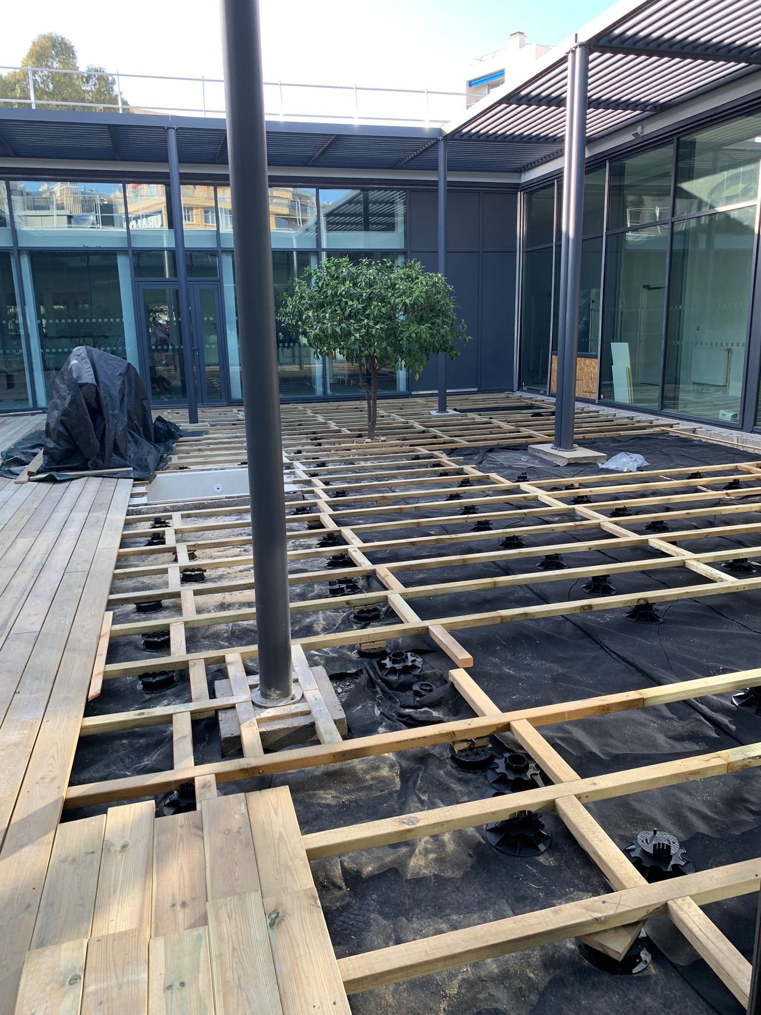 En sous-traitance dans les Alpes-Maritimes de notre partenaire AGEO, nous avons réalisé une terrasse de 204m2 dans une cour intérieure de l’école Les Eucalyptus de Nice (06). La terrasse a été posée sur plots plastiques réglables, sur un terrain encore peu aplani. La structure support est en pin de classe 4. Les lames de terrasse sont également en pin de classe 4 traité insecticide et fongicide. Les fixations sont effectuées avec des vis inox pour milieu marin, avec têtes affleurantes et alignement.